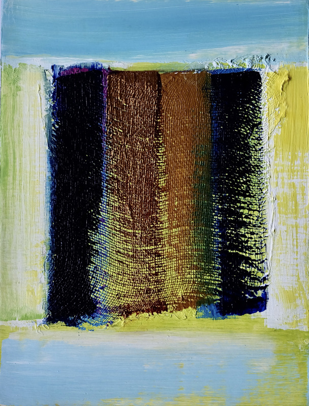 Pilgrim Cello also includes a collaboration with artist Gillian Lever (www.leverarts.org). Resulting from a creative dialogue starting in 2024 Gillian developed a set of seven small Seven Last Words abstract paintings that were exhibited as an integral part of each Meditation. The Seven Last Words paintings made the journey on my bike in a specially designed reliquary.