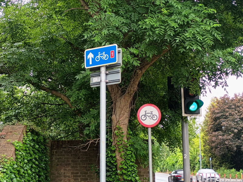 And what’s this? The friendly blue cycle route sign immediately followed by a stern red “no bicycles”. Which to believe?